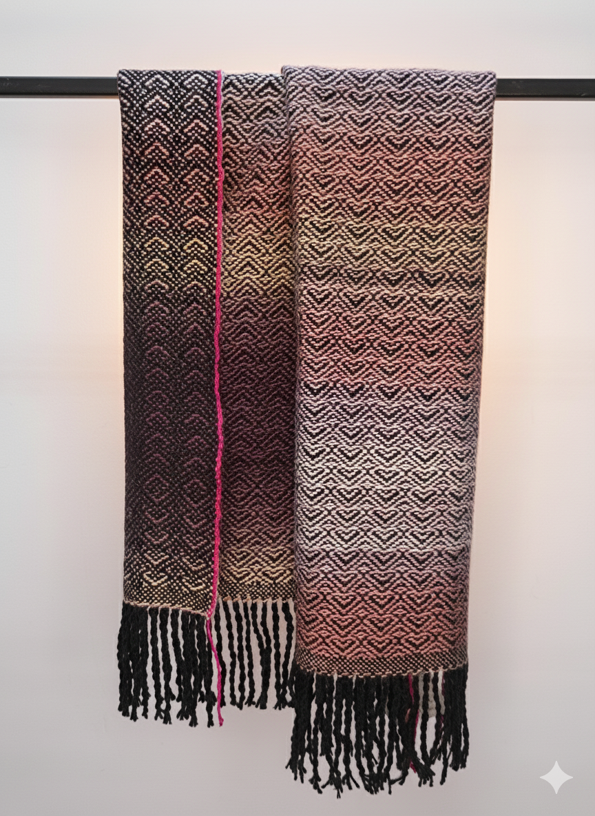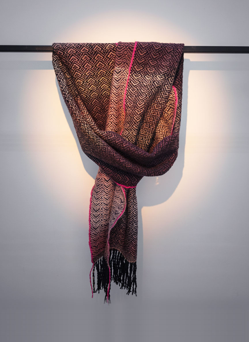 Ilgas šalikas, austas rankinėmis staklėmis iš alpakos ir merino vilnos mišinio yra švelnus ir minkštas. Matmenys 30x200 cm.