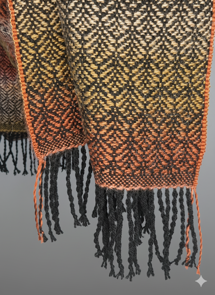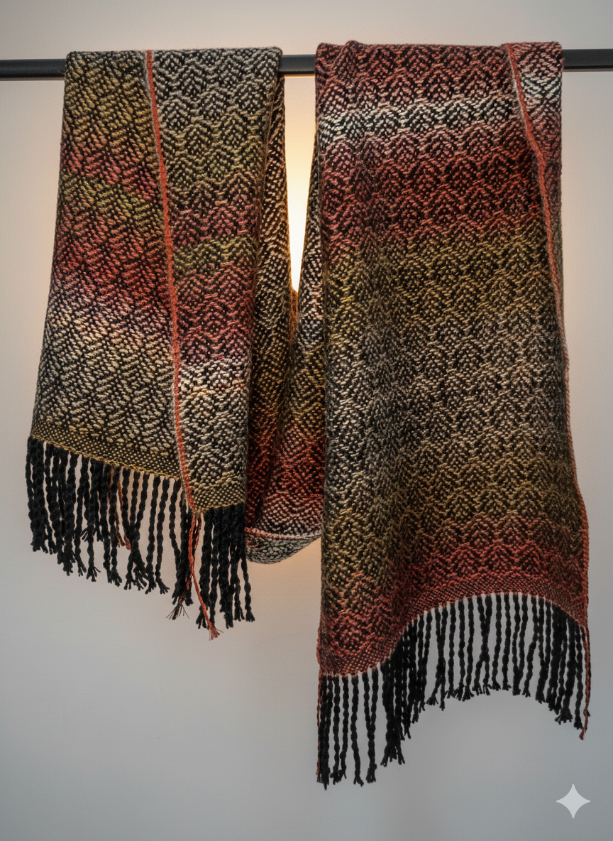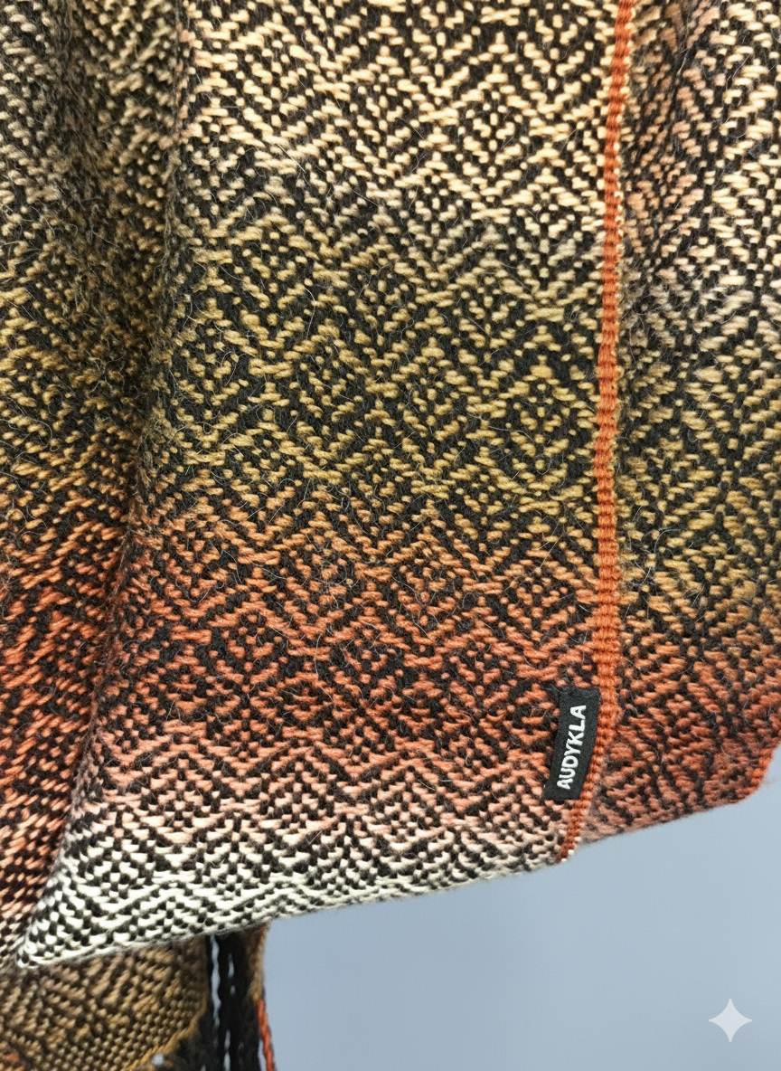 Ilgas šalikas, austas rankinėmis staklėmis iš alpakos ir merino vilnos mišinio yra švelnus ir minkštas.  Matmenys 30x200 cm.
