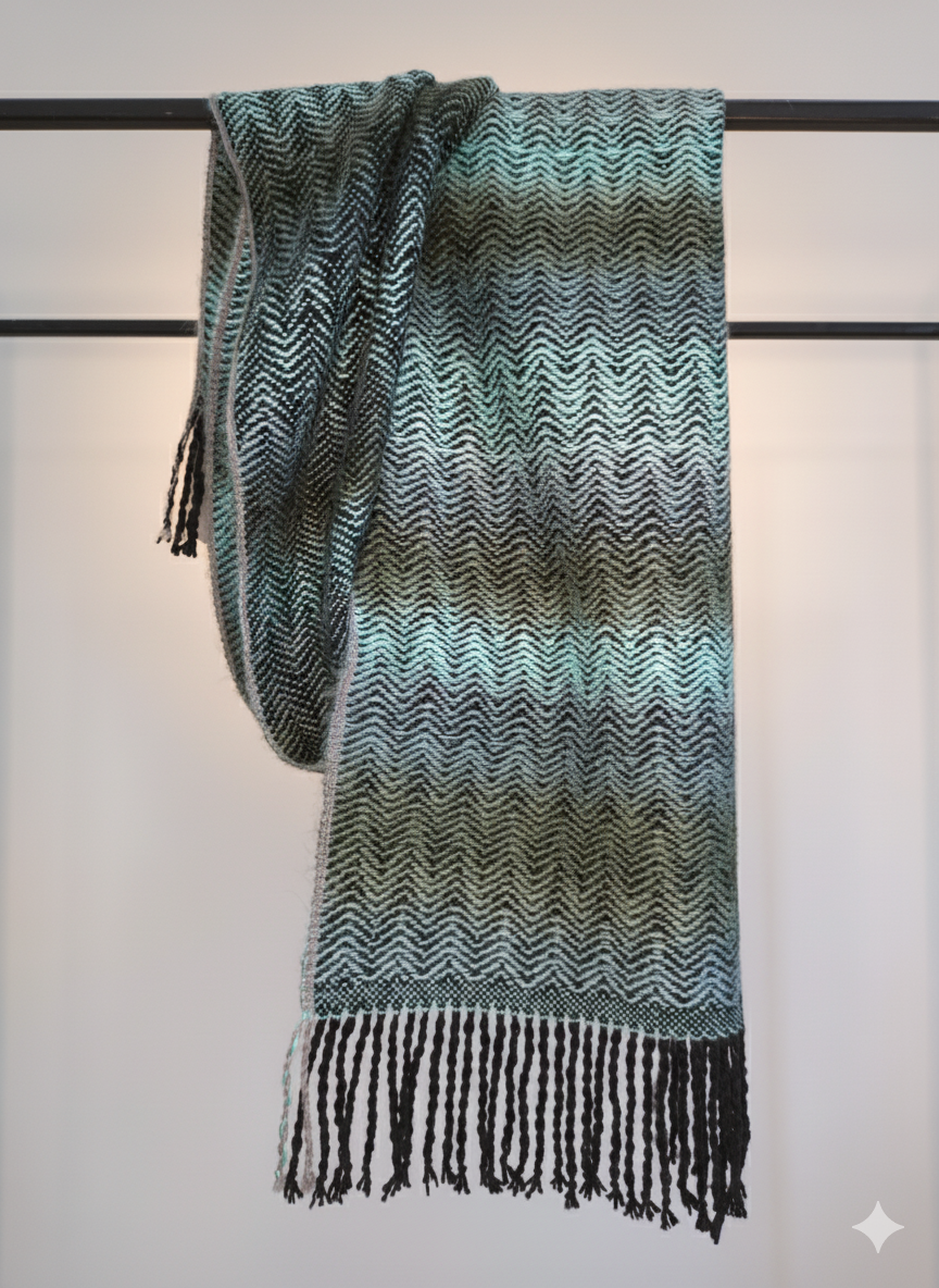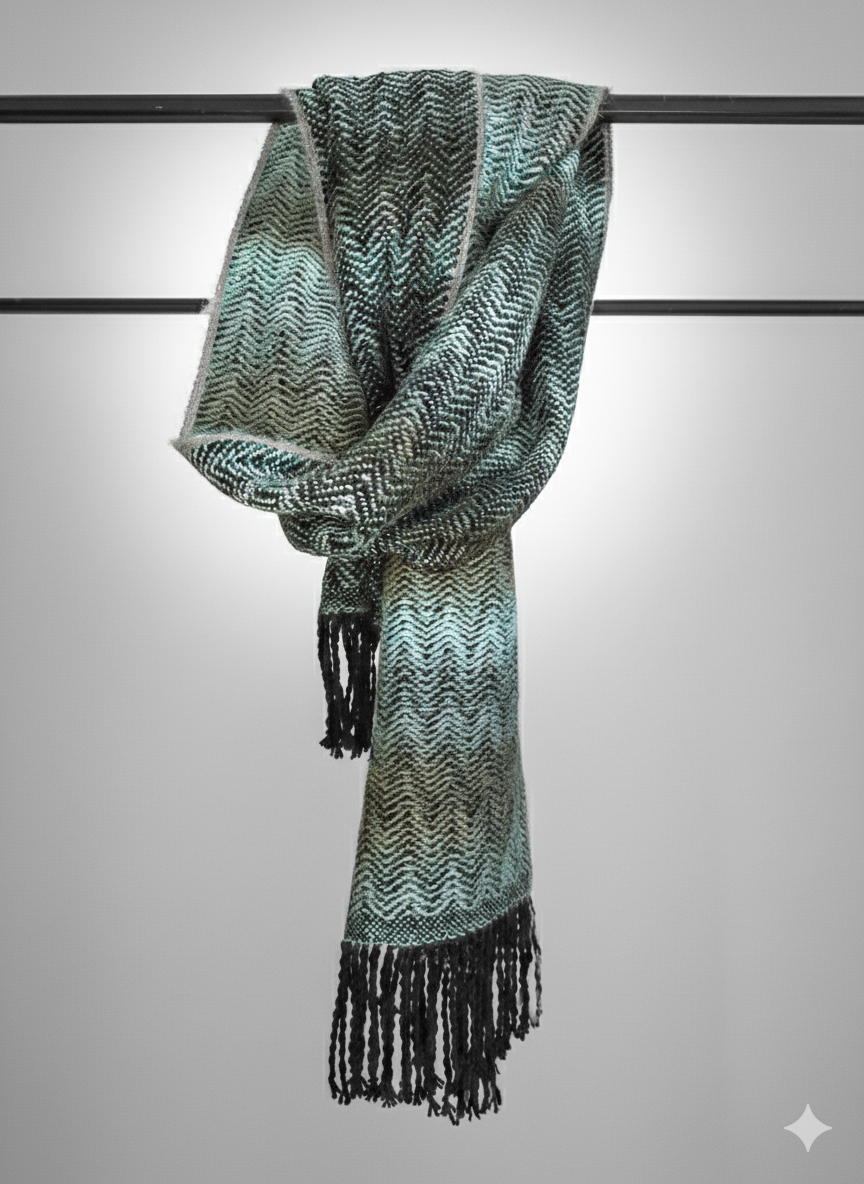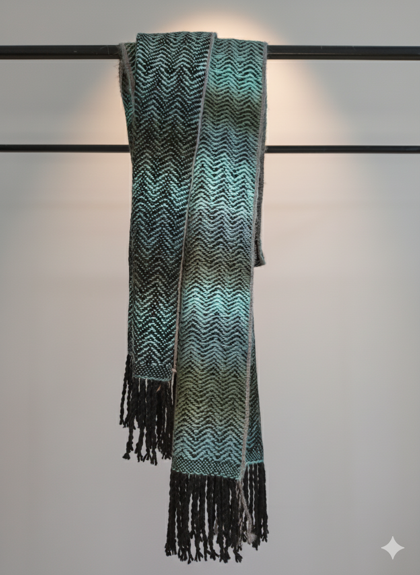 Ilgas šalikas, austas rankinėmis staklėmis iš alpakos ir merino vilnos mišinio yra švelnus ir minkštas. Matmenys 30x200 cm.